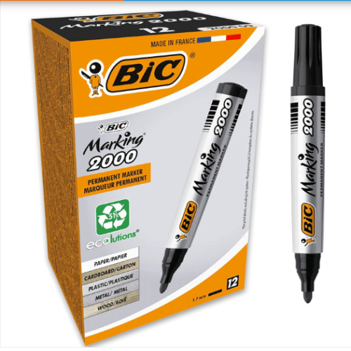 Marqueur Bic Marking 2000 - Nombre de pièce : 12 - Type d’encre : permanente à base d'alcool - Longueur de pointe : environ 1.7 mm - Forme de la pointe : Pointe bloquée solide - Résistant à l'essuyage et à l'eau - Sèche rapidement et résistant à la lumière - - Peut rester ouvert 1 mois sans sécher - Embout et capuchon à la couleur de l'encre - Adapté à plusieurs surfaces : papier, carton, plastique, verre, métal - Couleur : Noir