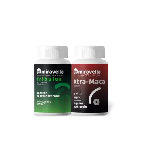 Pack Testo : Tribulus + Maca Maca Description : La Maca, ou Lepidium meyenii, est une plante adaptogène riche en nutriments, connue pour ses effets bénéfiques sur la libido et la fertilité. Cultivée depuis des millénaires, notamment par les Incas, la maca est un puissant tonique naturel. Bienfaits : Aphrodisiaque Puissant : Stimule la libido et le désir sexuel. Fertilité Améliorée : Augmente la production et la mobilité des spermatozoïdes. Énergie et Vitalité : Un tonique naturel pour vos performances physiques et mentales. Richesse Nutritionnelle : Source élevée de fer, vitamines B, et potassium. Ingrédients : Extrait sec de Maca (10:1) : 1000 mg par 2 gélules Cellulose microcristalline, Gélules d’origine bovine Halal Utilisation : 1-2 gélules par jour pendant 3 mois, renouvelable. Précautions : Non recommandé pour les femmes enceintes/allaitantes sauf sous avis médical. Tribulus Description : Tribulus Terrestris, un complément alimentaire majeur pour les hommes, connu pour stimuler le désir sexuel et soutenir la santé du système reproducteur. Bienfaits : Améliore la libido et le plaisir. Augmente la mobilité, la viabilité et le nombre de spermatozoïdes, favorisant ainsi la fertilité. Ingrédients : Extrait sec de Tribulus (90% Saponines) : 1200 mg (990 mg par 3 gélules) Maltodextrine, Gélules d’origine bovine Halal Utilisation : Prendre 3 gélules par jour, réparties en 2 prises 1 gélules matin et 2 gélules 30 minutes avant effort. Précautions : Non recommandé pour les femmes enceintes et allaitantes, ou personnes sous traitements hormonaux ou diabétiques.