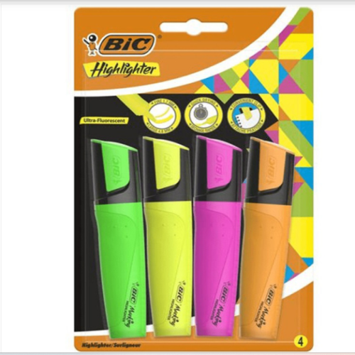 Pochette De 4 Surligneurs Highlighter Flat BIC - Pochette de 4 Surligneurs - Point fort : La pointe Plat polyvalente crée des lignes fines | Clip pratique à emporter partout | Surligneur corps plat confortable - Couleur: Rose, Oranger, vert, Jaune